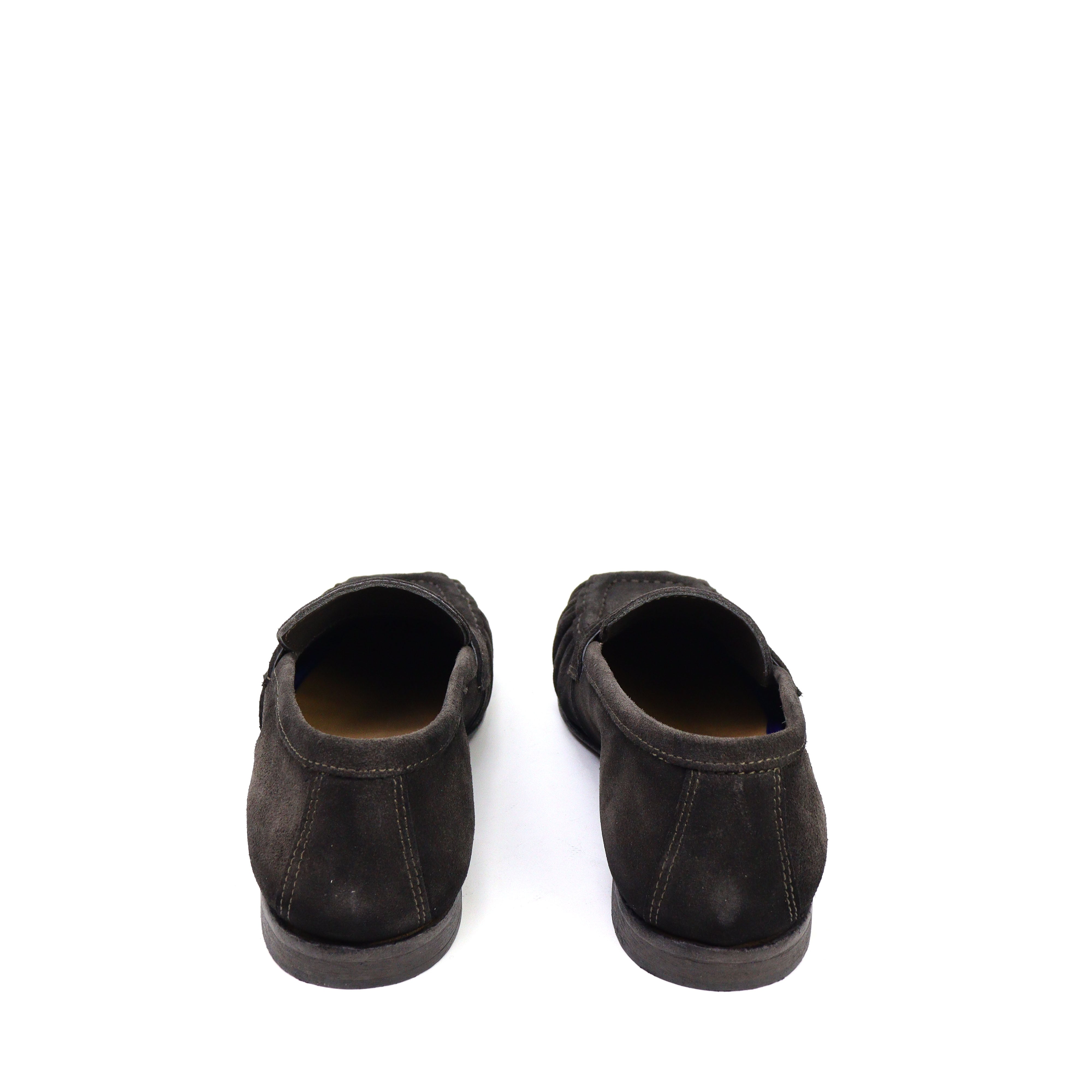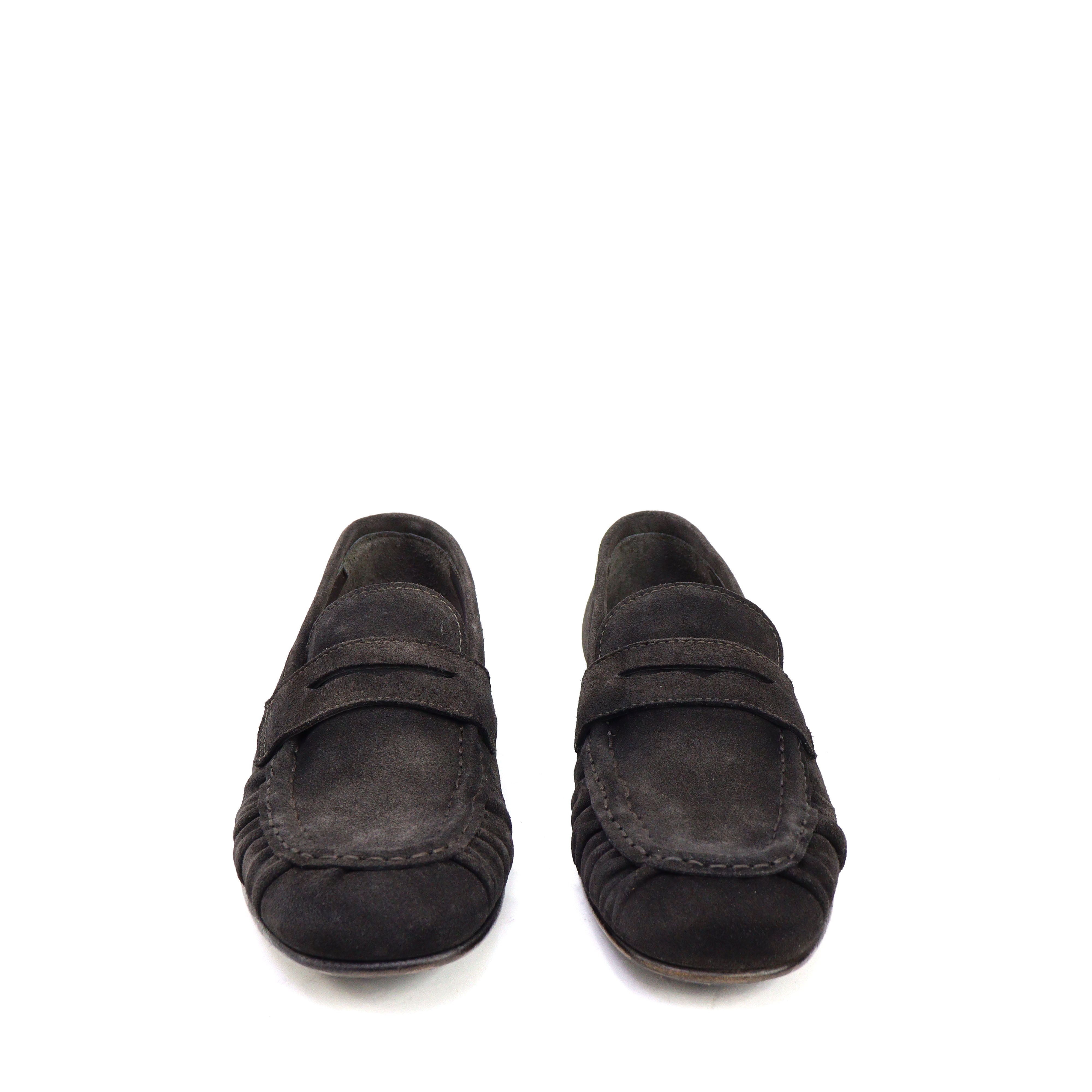 Mocassino marrone di FRATELLI RENNELLA in camoscio con bendina e tomaia arricciata sulle cuciture anteriori fondo in cuoio con gomma iniettata.