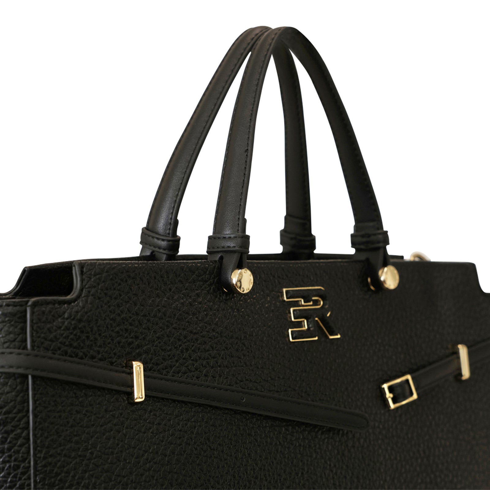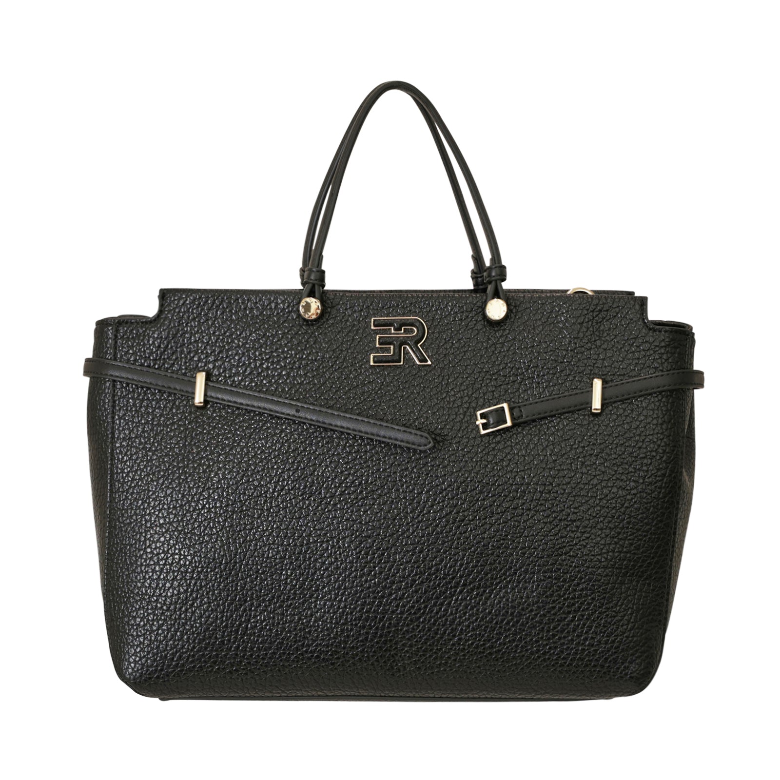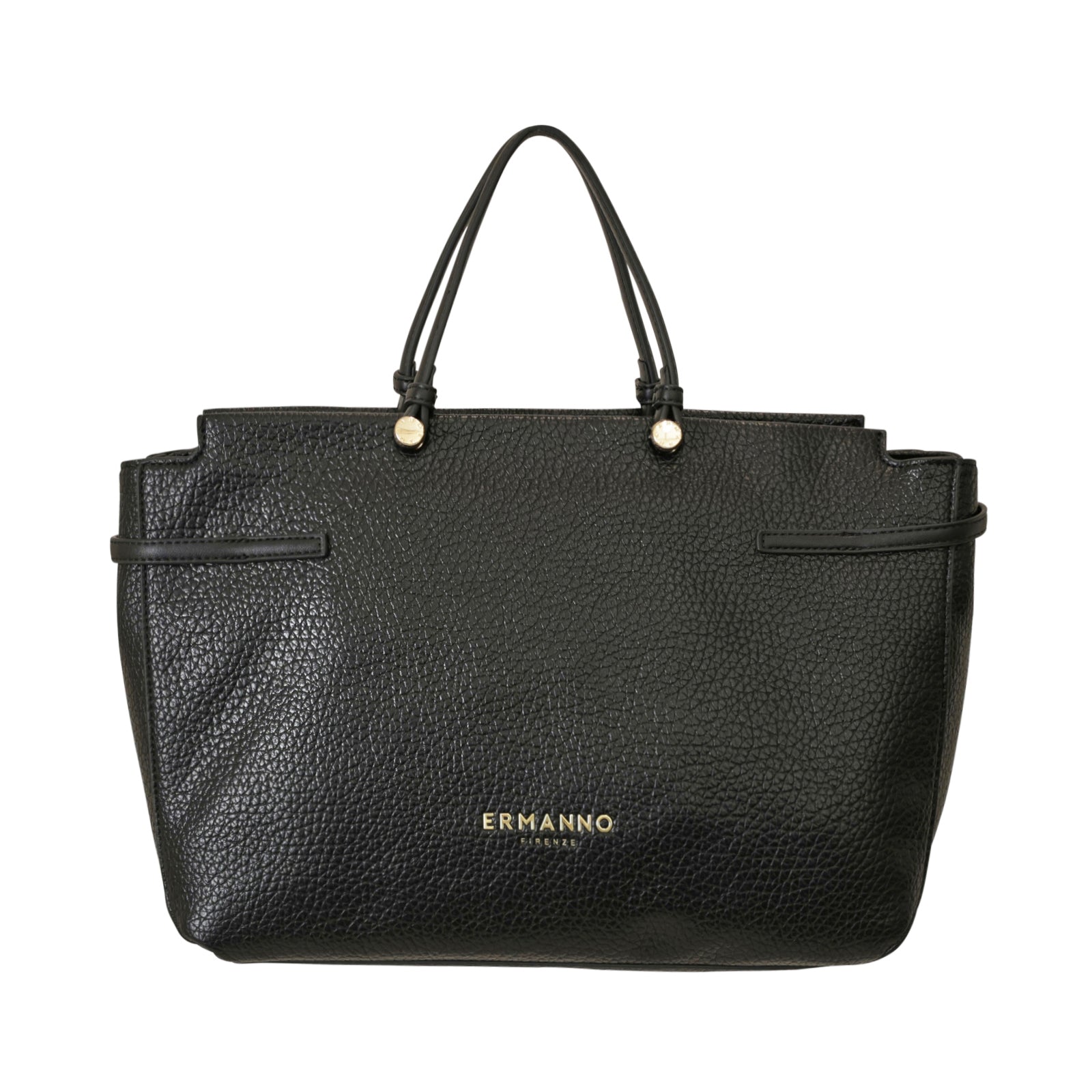 Borsa a mano UNITY nera di ERMANNO SCERVINO in ecopelle con effetto bottalato, doppio manico, logo coi profili in metallo oro e chiusura con zip. Misure 35x23x13 cm.