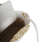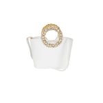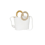 Borsa CIRCLE bianca di SEBILLO in pelle bottalata con manico circolare in cristalli e tracolla interna. Misure 29x17x9cm.