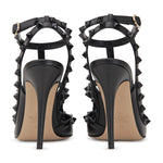 Decollette ROCKSTUD nera di VALENTINO GARAVANI in pelle con borchie laccate in tinta, cinturini alla caviglia. Tacco 100mm, fondo in cuoio.