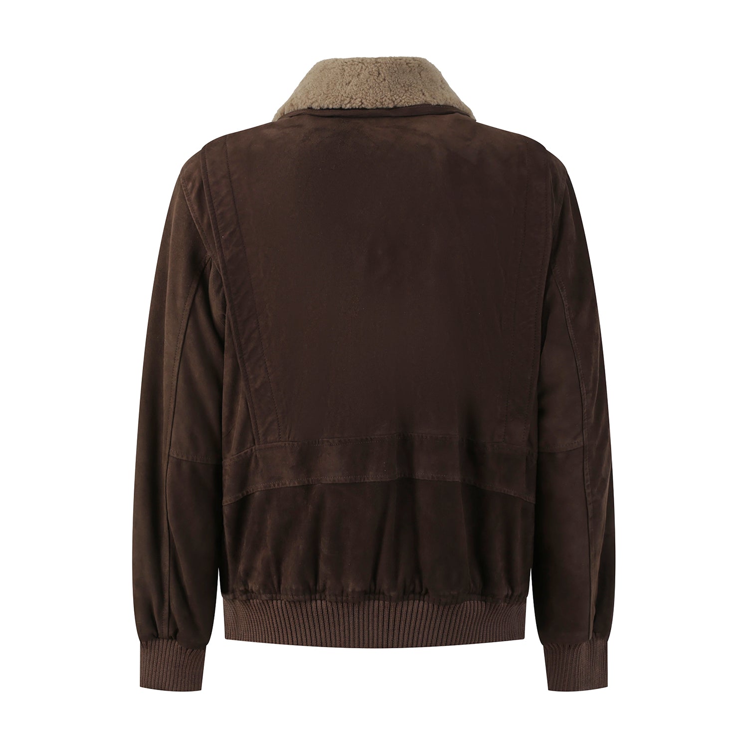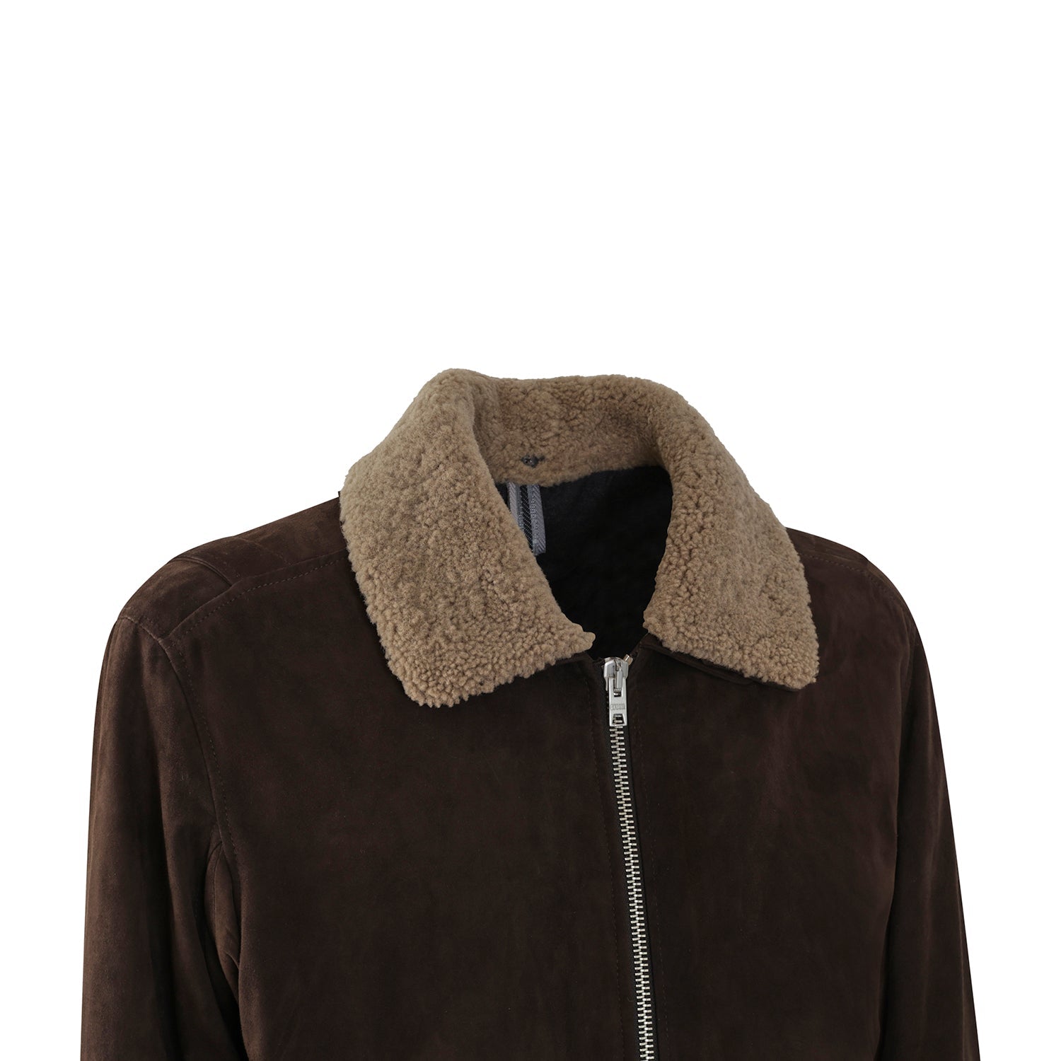 Giacca marrone di DFOUR in camoscio con chiusura con zip, collo in pelliccia, tasche con patte e polsini e fondo in tessuto a costine.