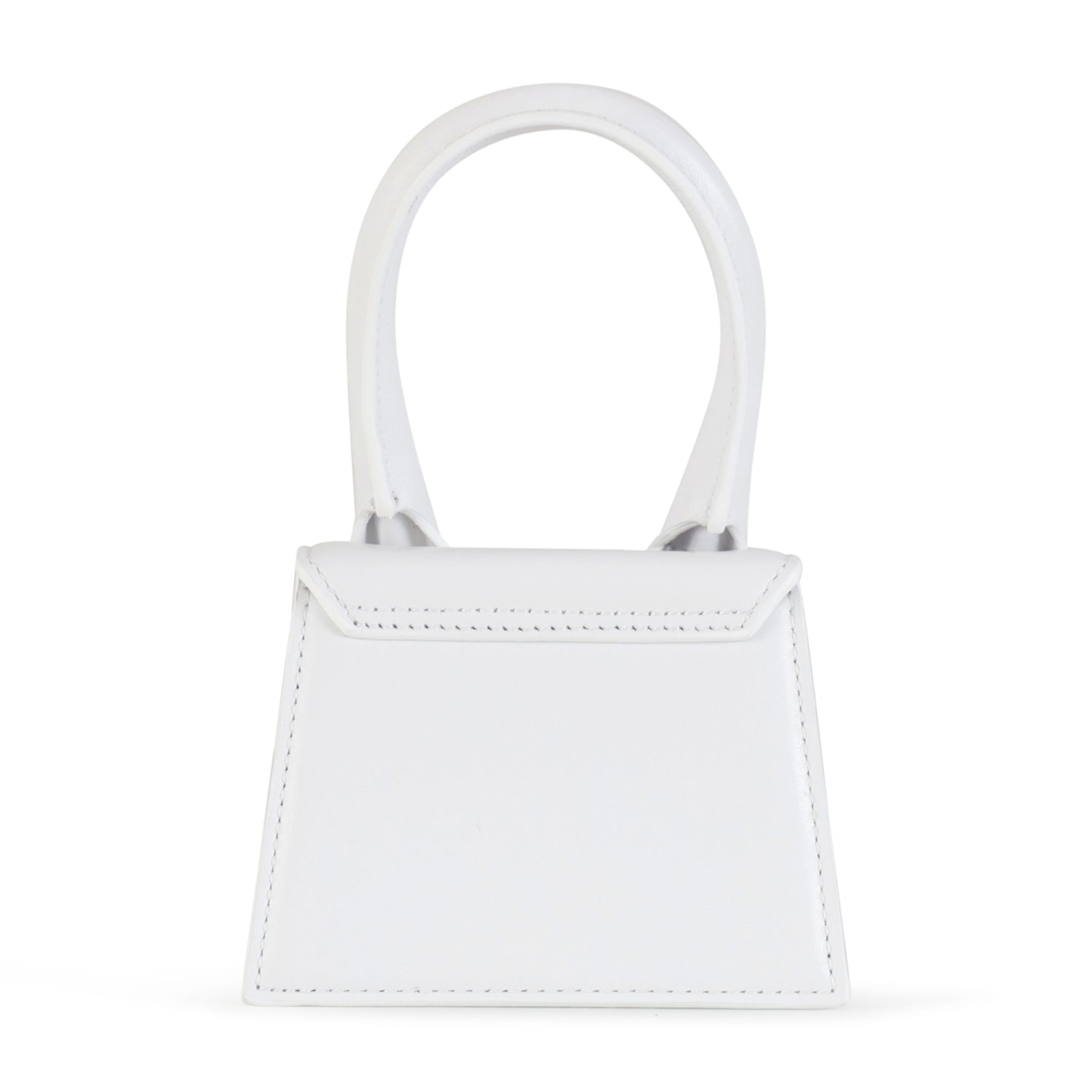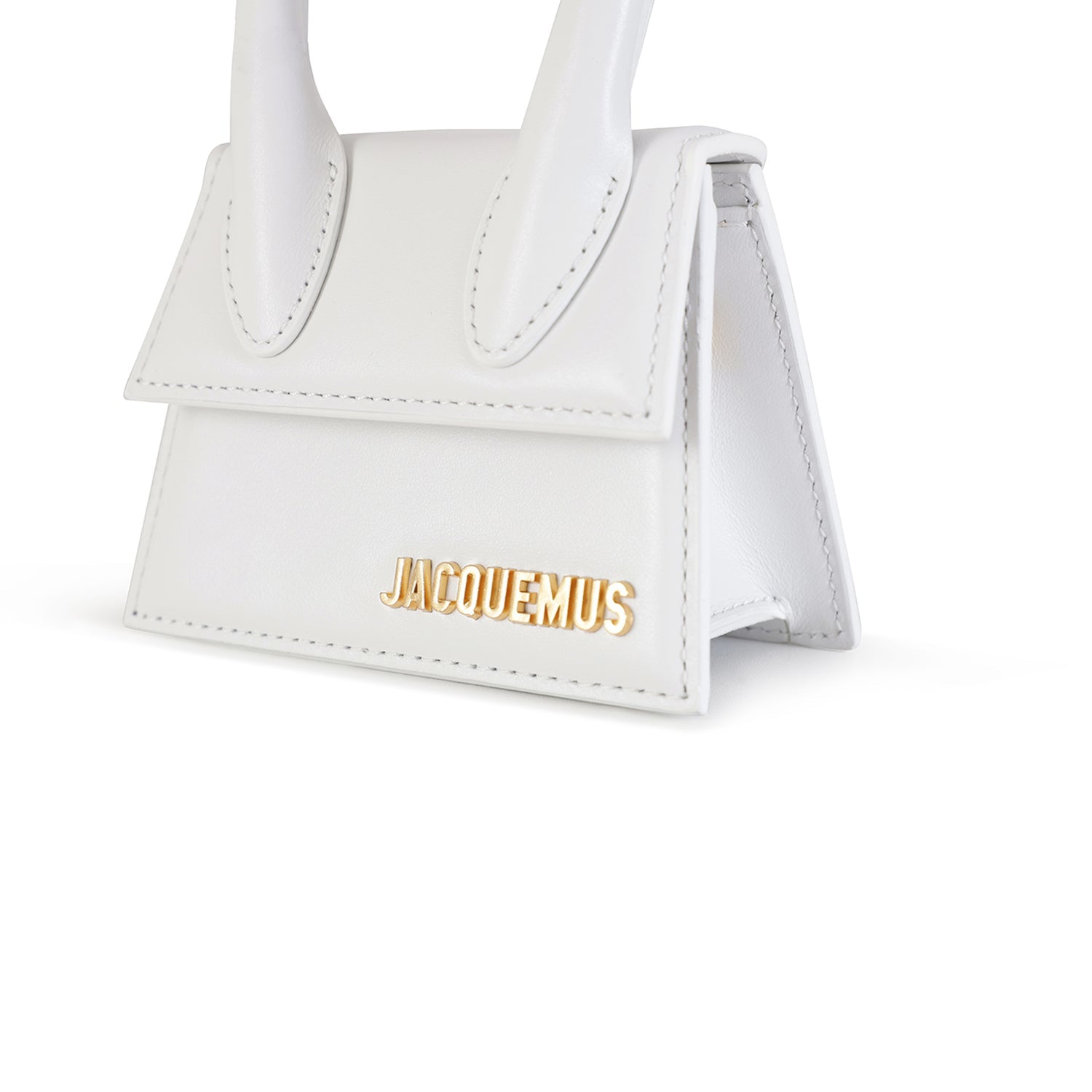 Le Chiquito bianca di JACQUEMUS in pelle con tracolla interna in pelle in tinta, chiusura con patta, manico singolo e logo in metallo oro. Misura 13x9x6 cm.
