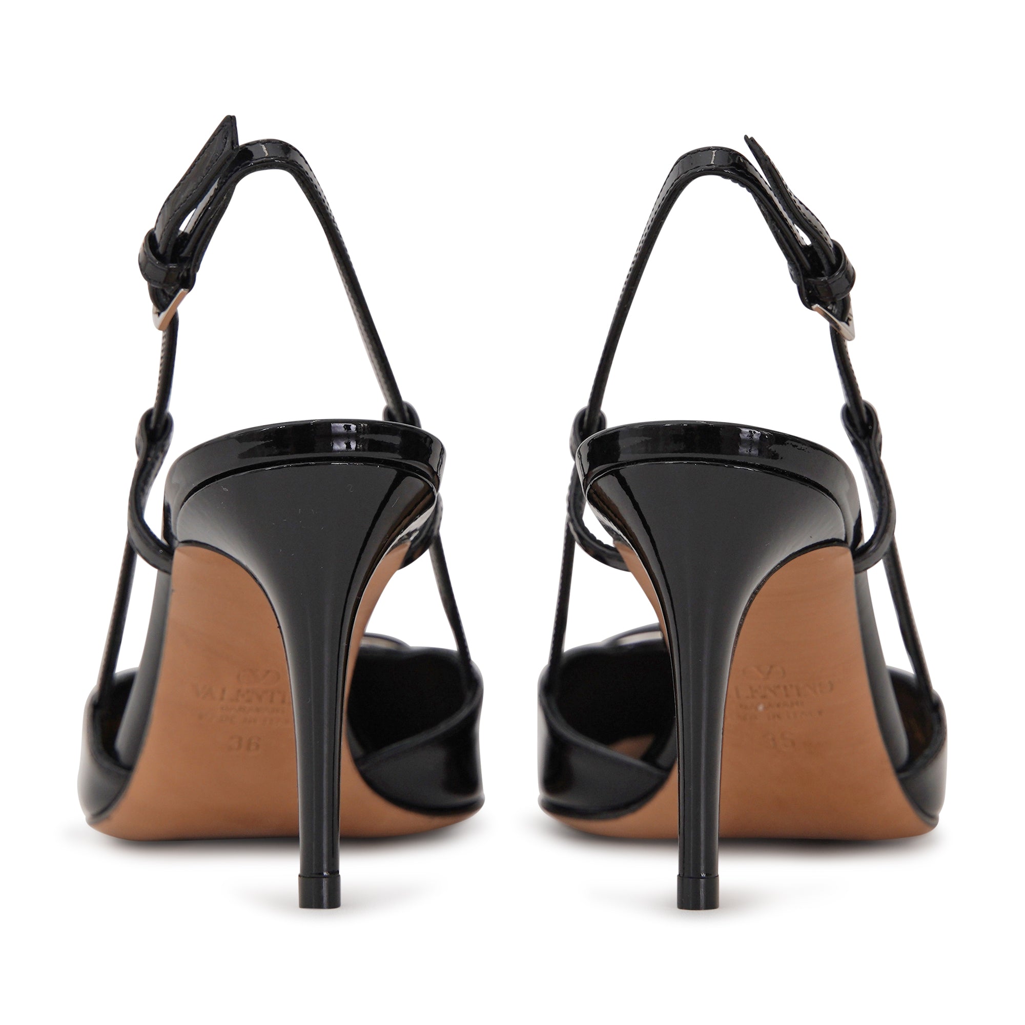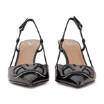 Slingback VLOGO nera di VALENTINO GARAVANI in vernice con accessorio logo laccato in tinta, tacco 80mm, fondo in cuoio.