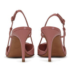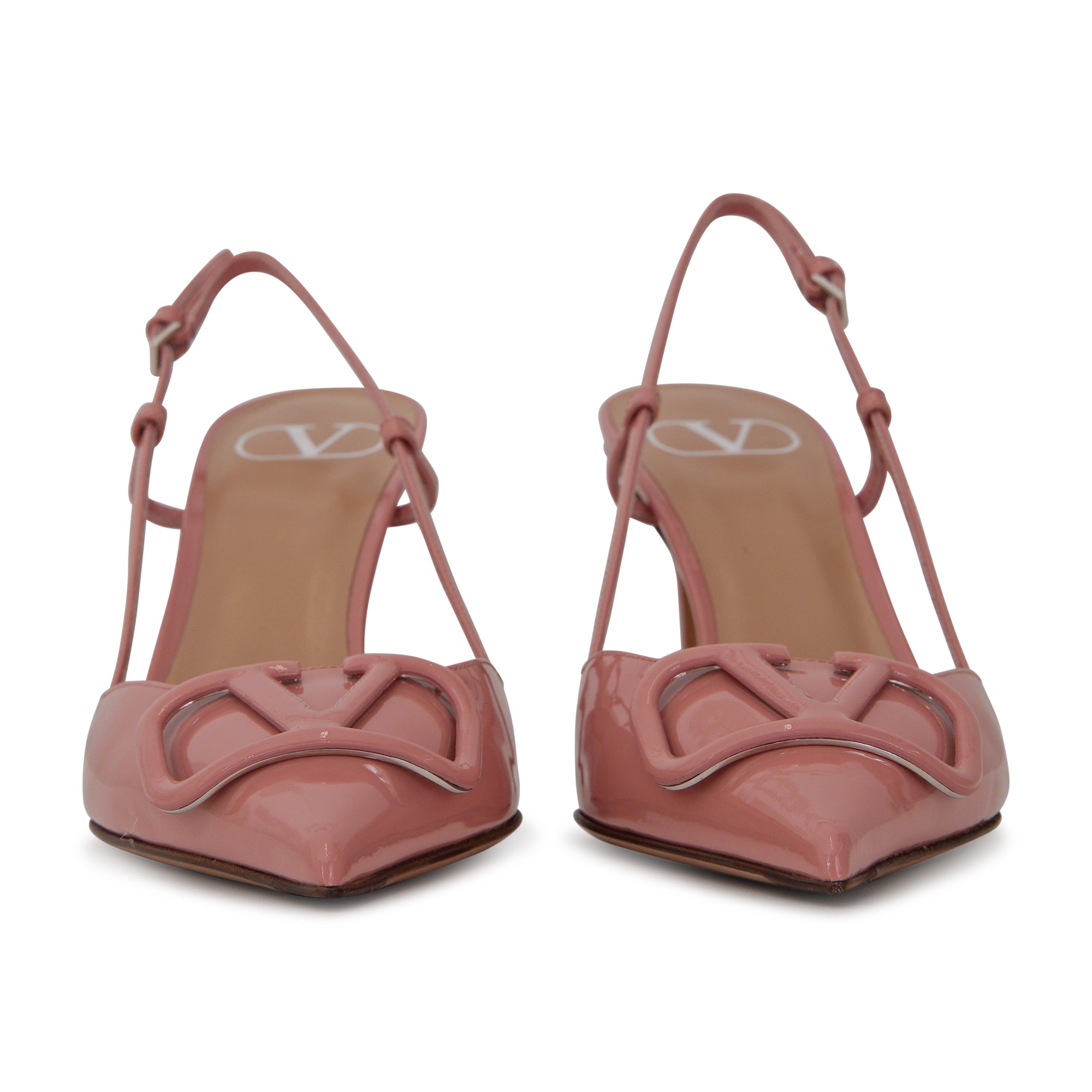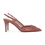 Slingback VLOGO rosa di VALENTINO GARAVANI in vernice con accessorio logo laccato in tinta, tacco 80mm, fondo in cuoio.
