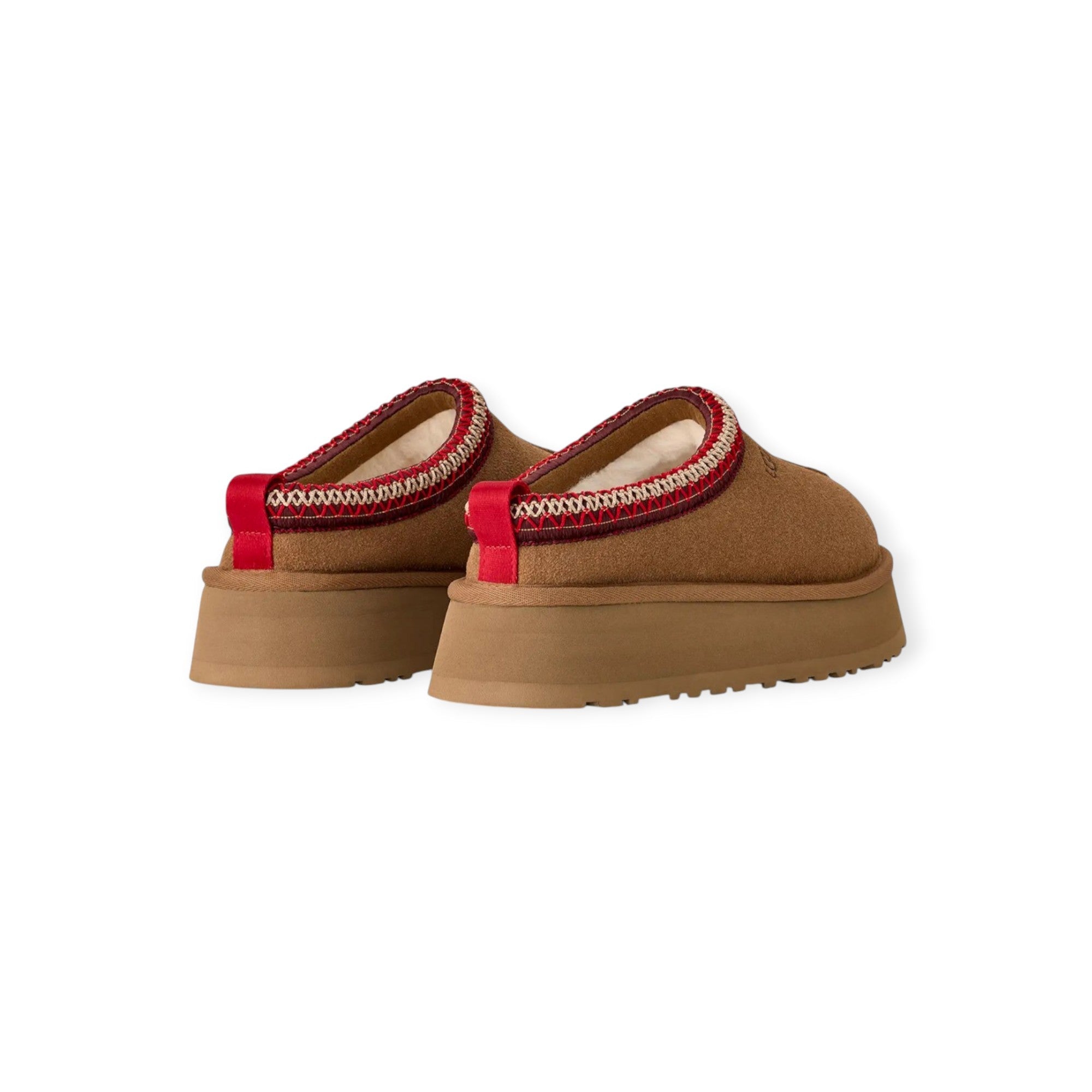 SLIPPER TAZZ II cuoio di UGG in camoscio con interno morbido in montone, Bordo in tessuto in contrasto rosso e beige. Suola in EVA da canna da zucchero. Altezza del plateau 4,4 cm. Logo UGG stampato a caldo in rilievo, etichetta in tessuto con logo UGG sulla soletta.