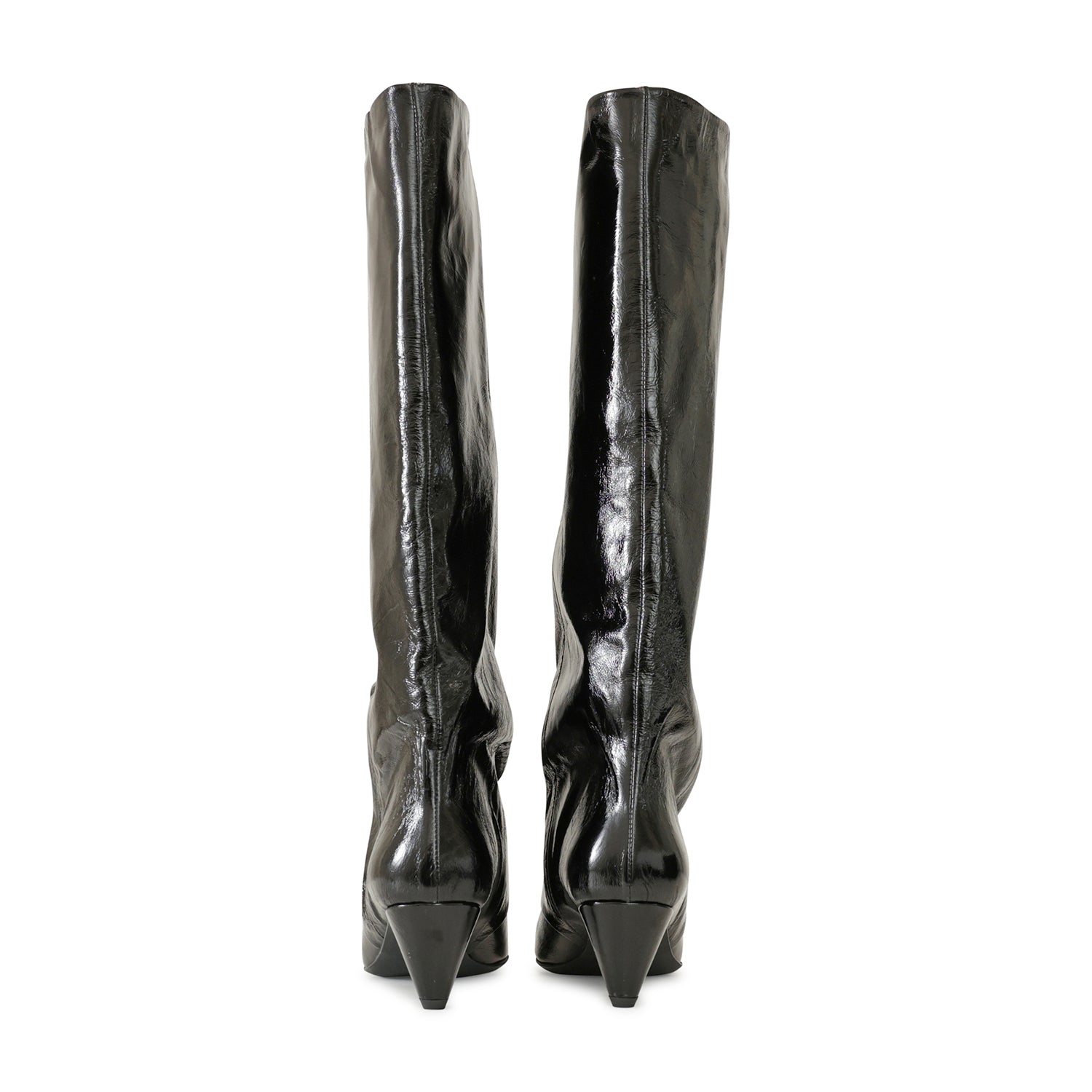 Stivale ALIANA nero di ALCHIMIA in vernice con effetto crash, gambale over, forma a punta, tacco 50mm, calzata a tubo.