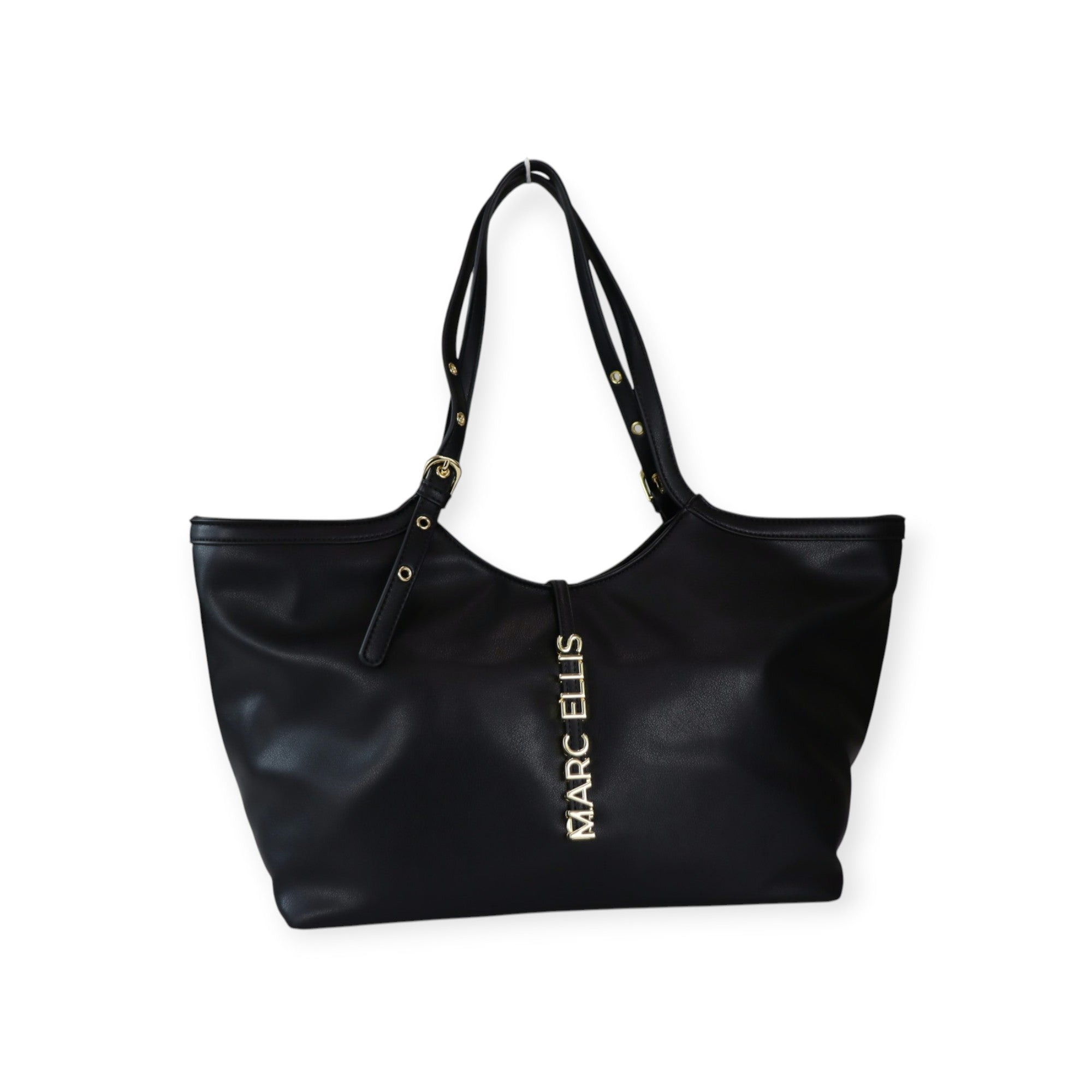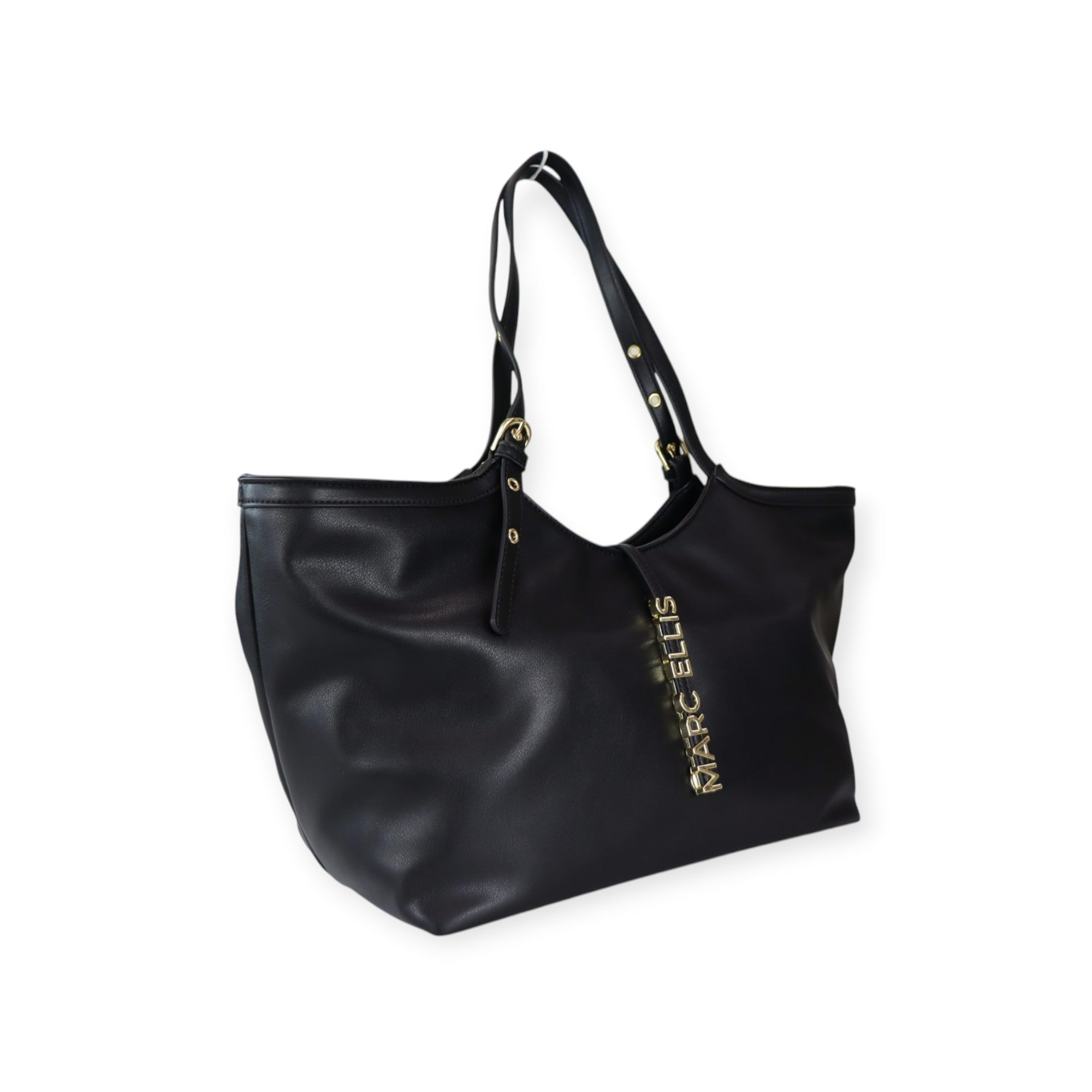 Borsa shopping SCARLET nera di MARC ELLIS in ecopelle con doppio manico, chiusura con pattina con logo lettering in metallo. Misure 49x26x18 cm.