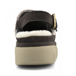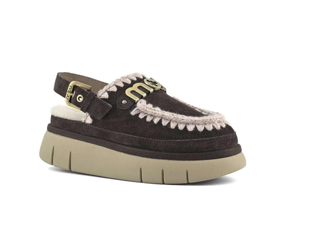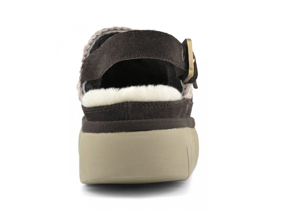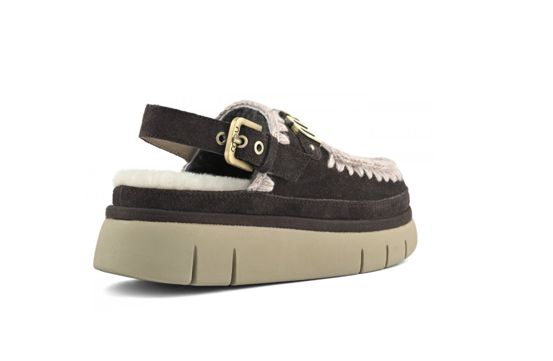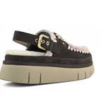 Eskimo clog slipper marrone di MOU in camoscio con interno in montone, cuciture in lana in rosa, strappo posteriore con logo in metallo. Fondo in gomma.