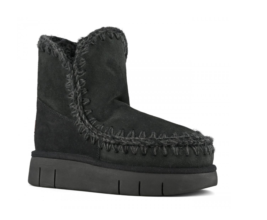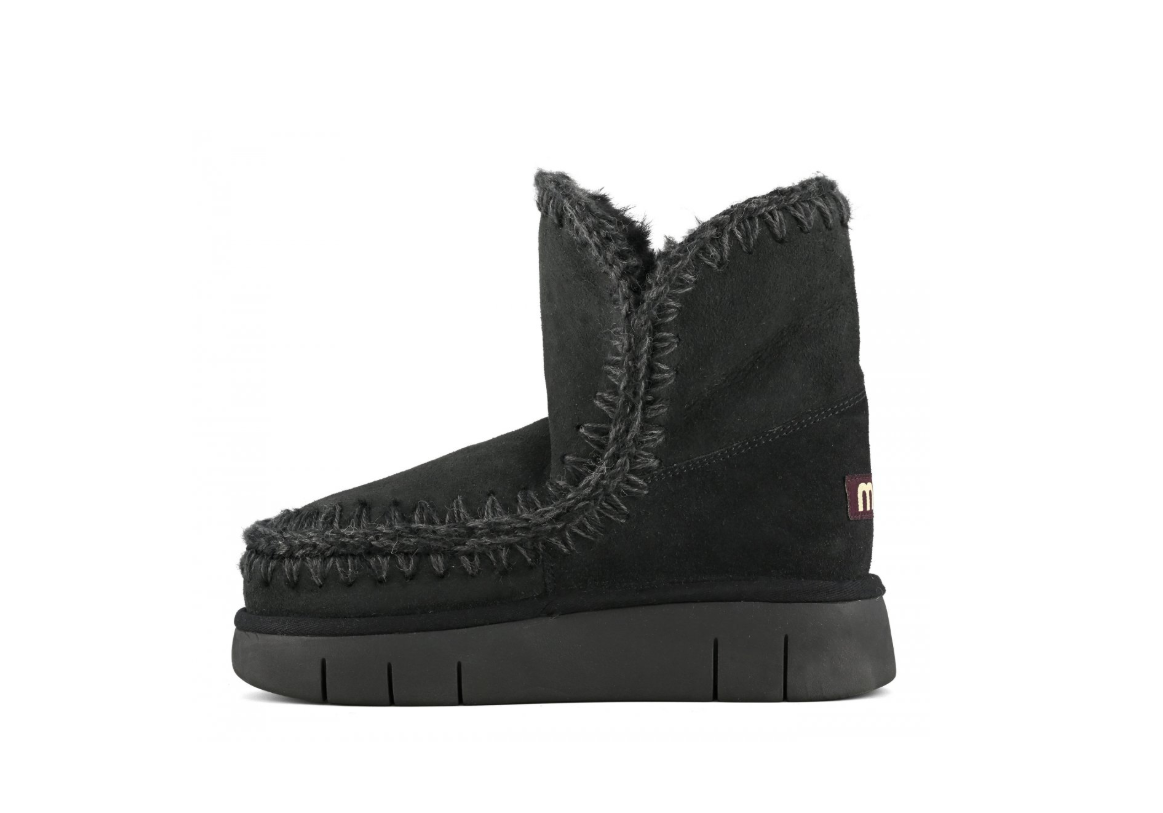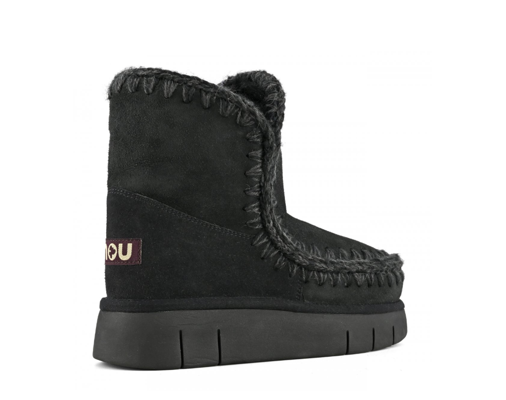 Eskimo18 bounce nero di MOU in camoscio con interno in montone, cuciture in lana in tinta, logo in tessuto. Altezza 18cm. Fondo in gomma.