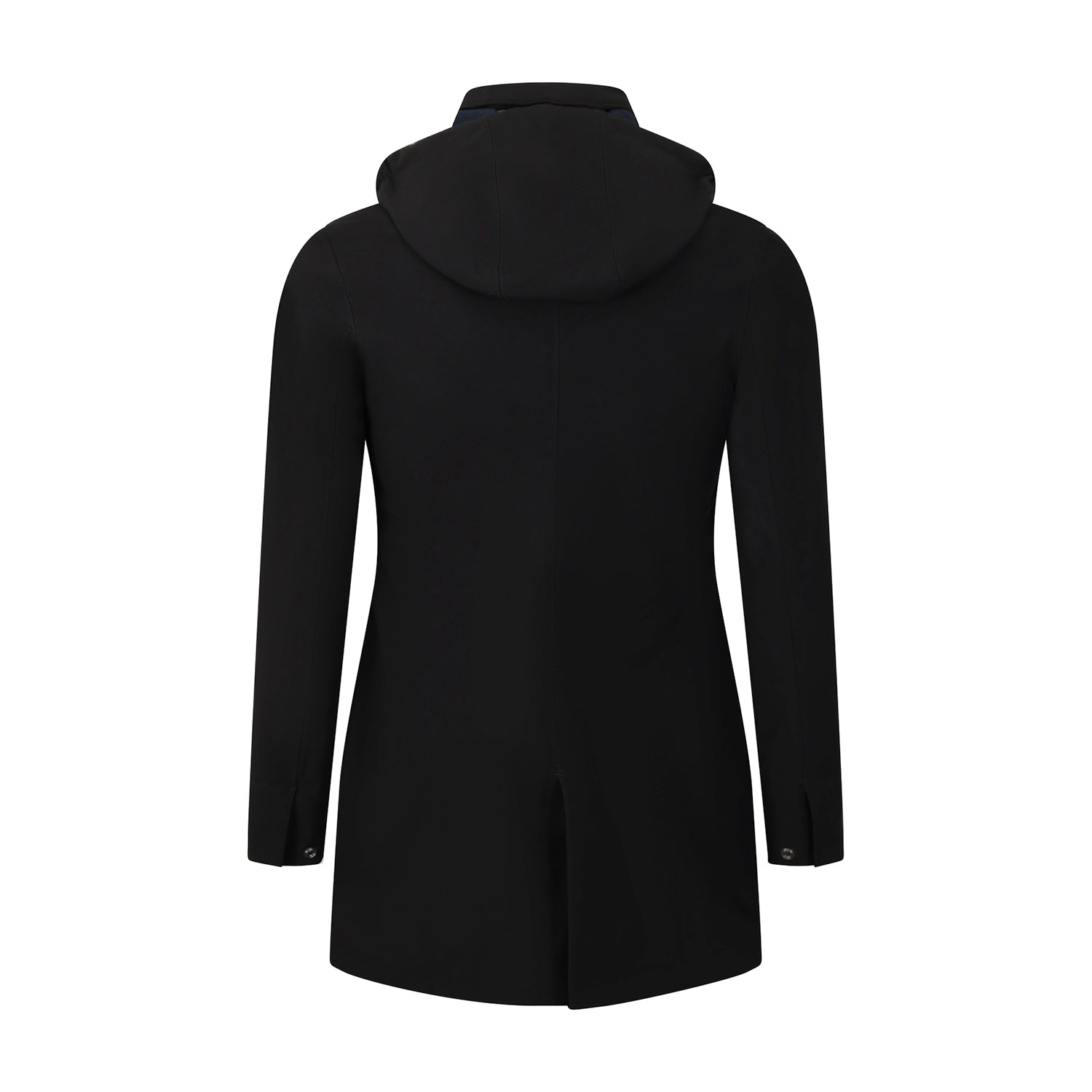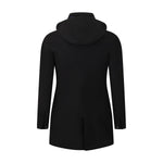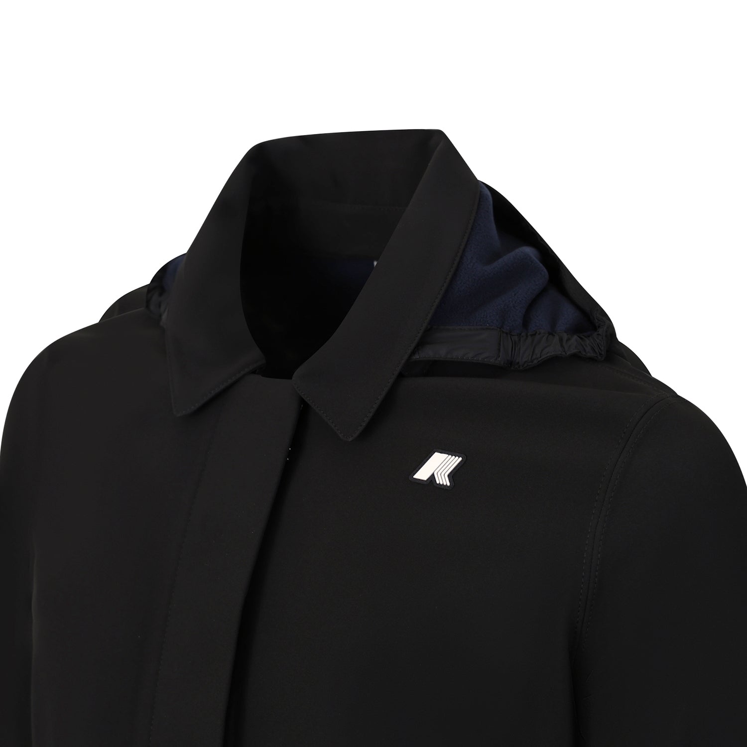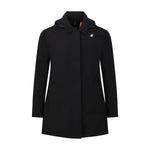 Giacca MATHY BONDED nero di K-WAY in tessuto tecnico con cappuccio, chiusura con zip nascosta, interno in tessuto termico blu. Logo bianco. Spacco posteriore.