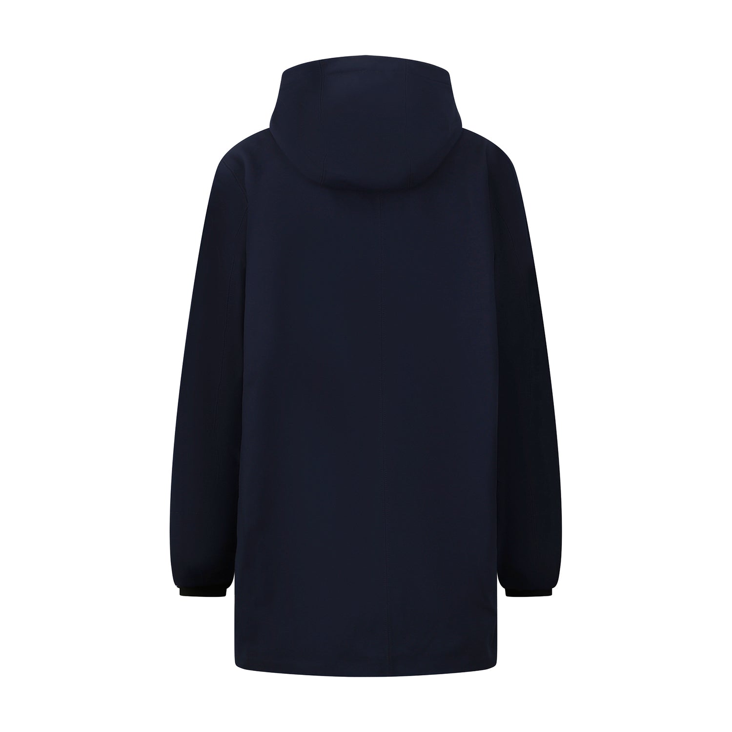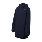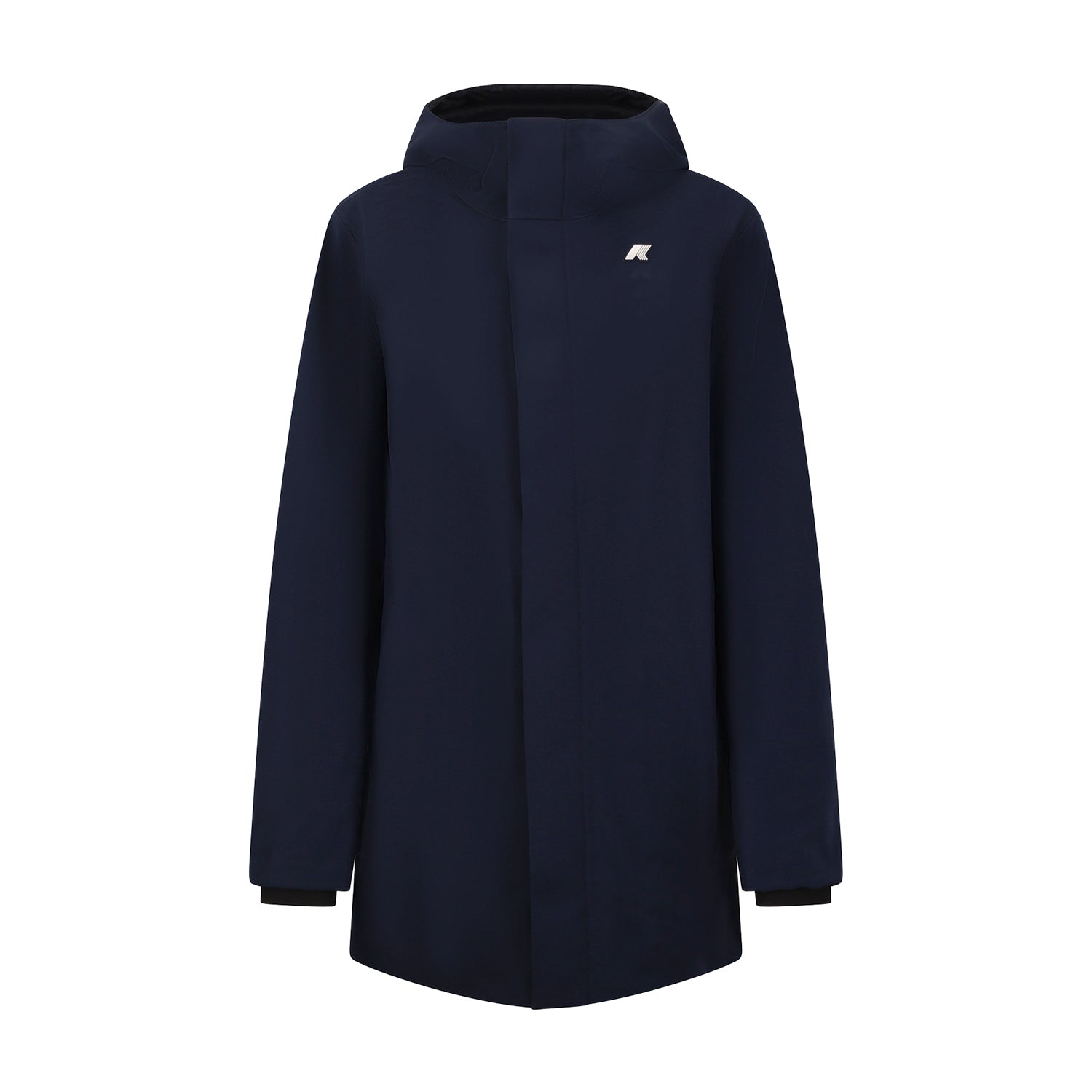 Giacca MARLYN BONDED blu di K-WAY in tessuto tecnico con cappuccio, chiusura con zip nascosta, interno in tessuto termico blu. Logo bianco. Tasche a filetto