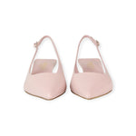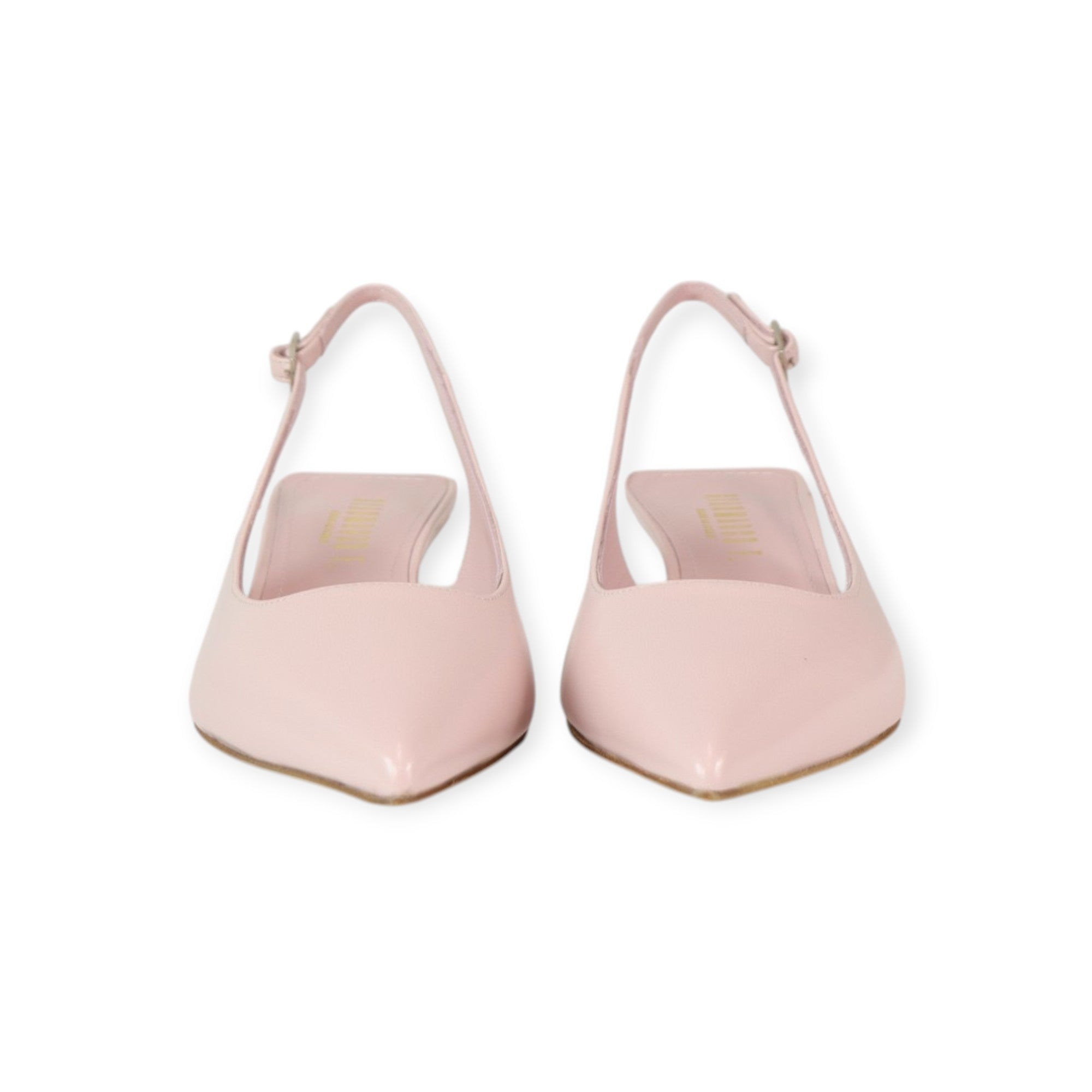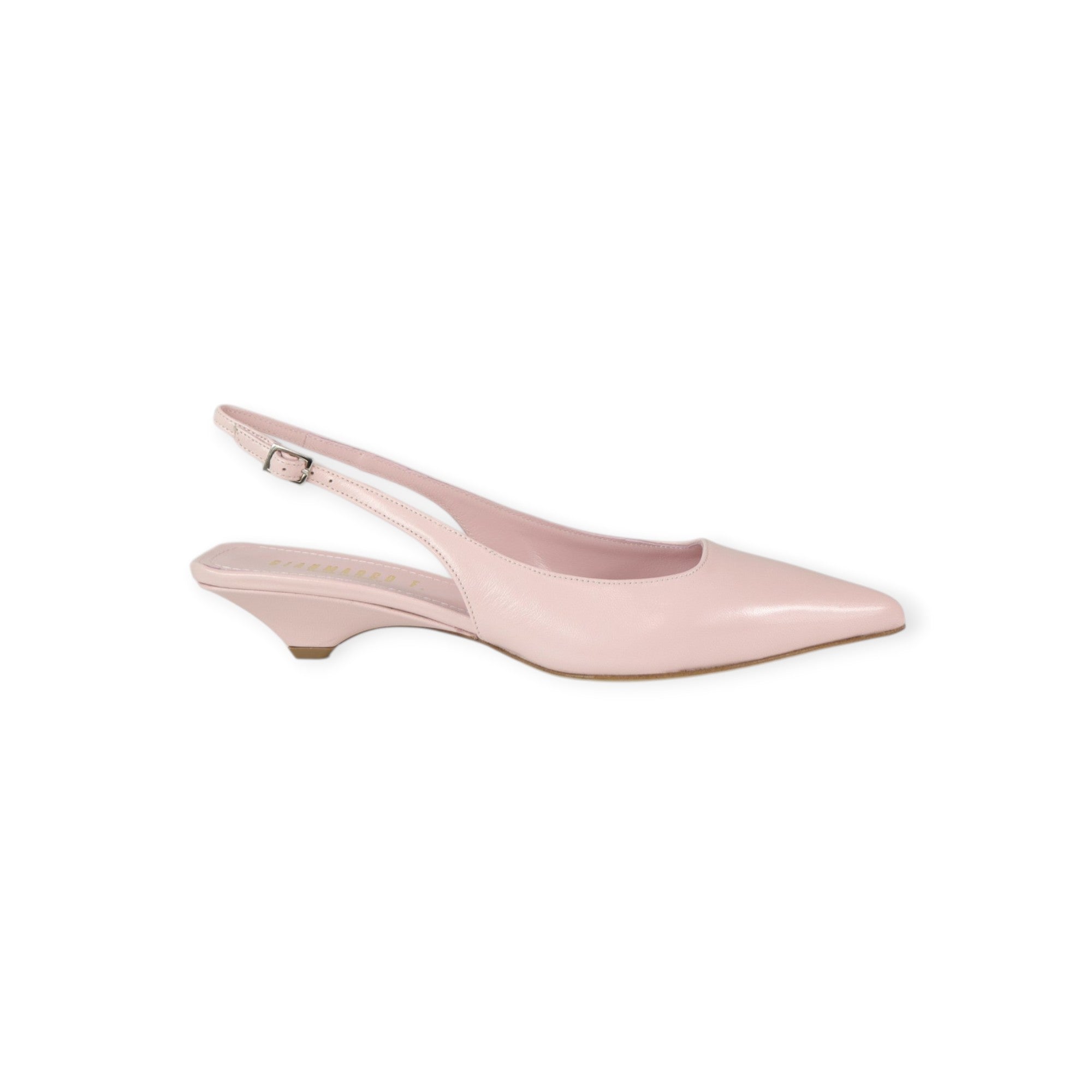 Slingback rosa di GIANMARCO F. in vernice con chiusura con fibbietta laterale, tacco 30mm conico, fondo in cuoio.