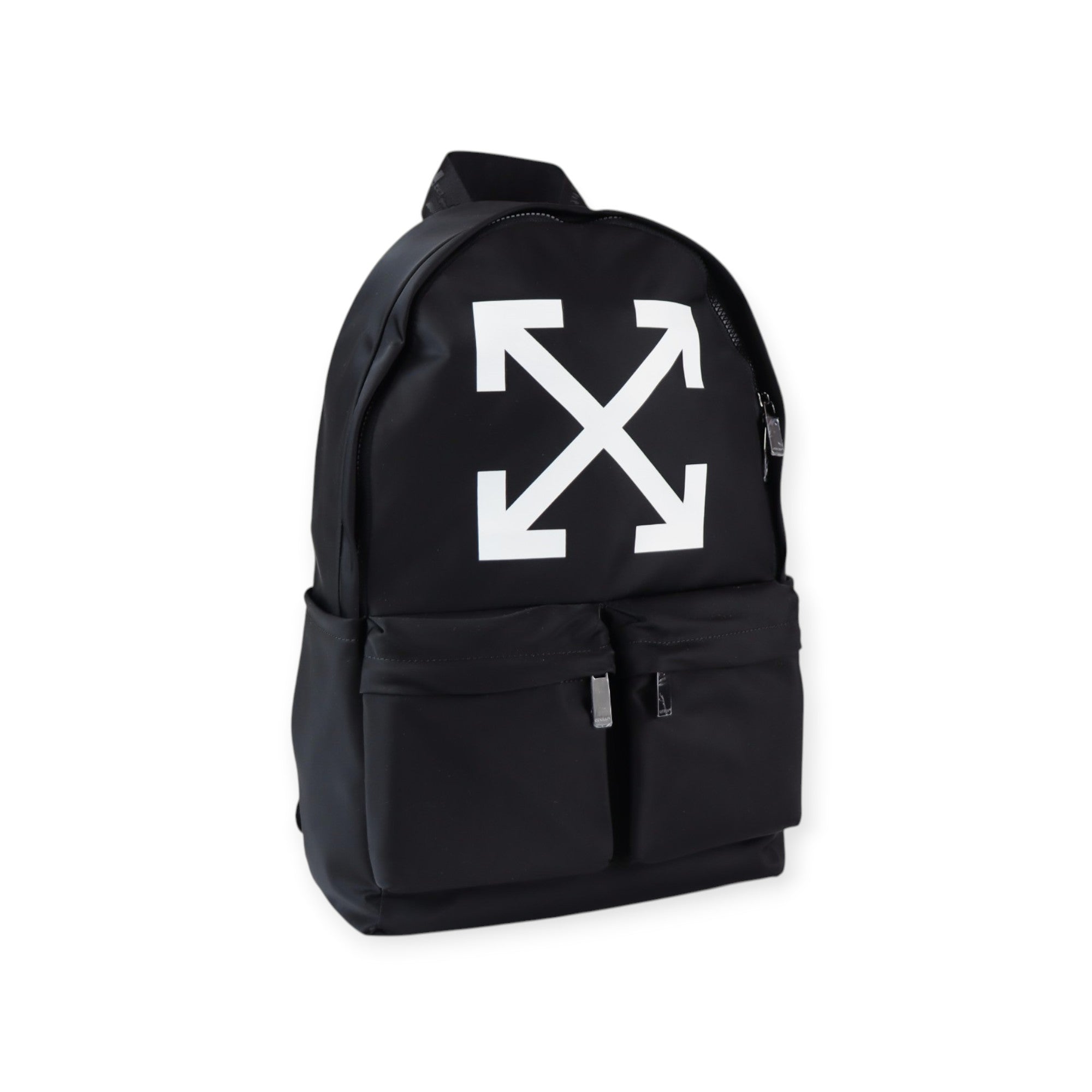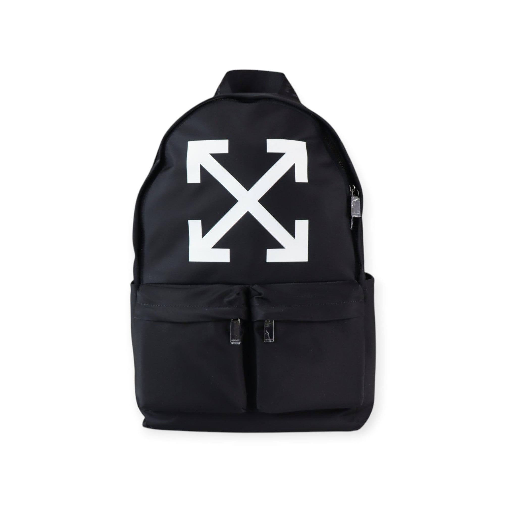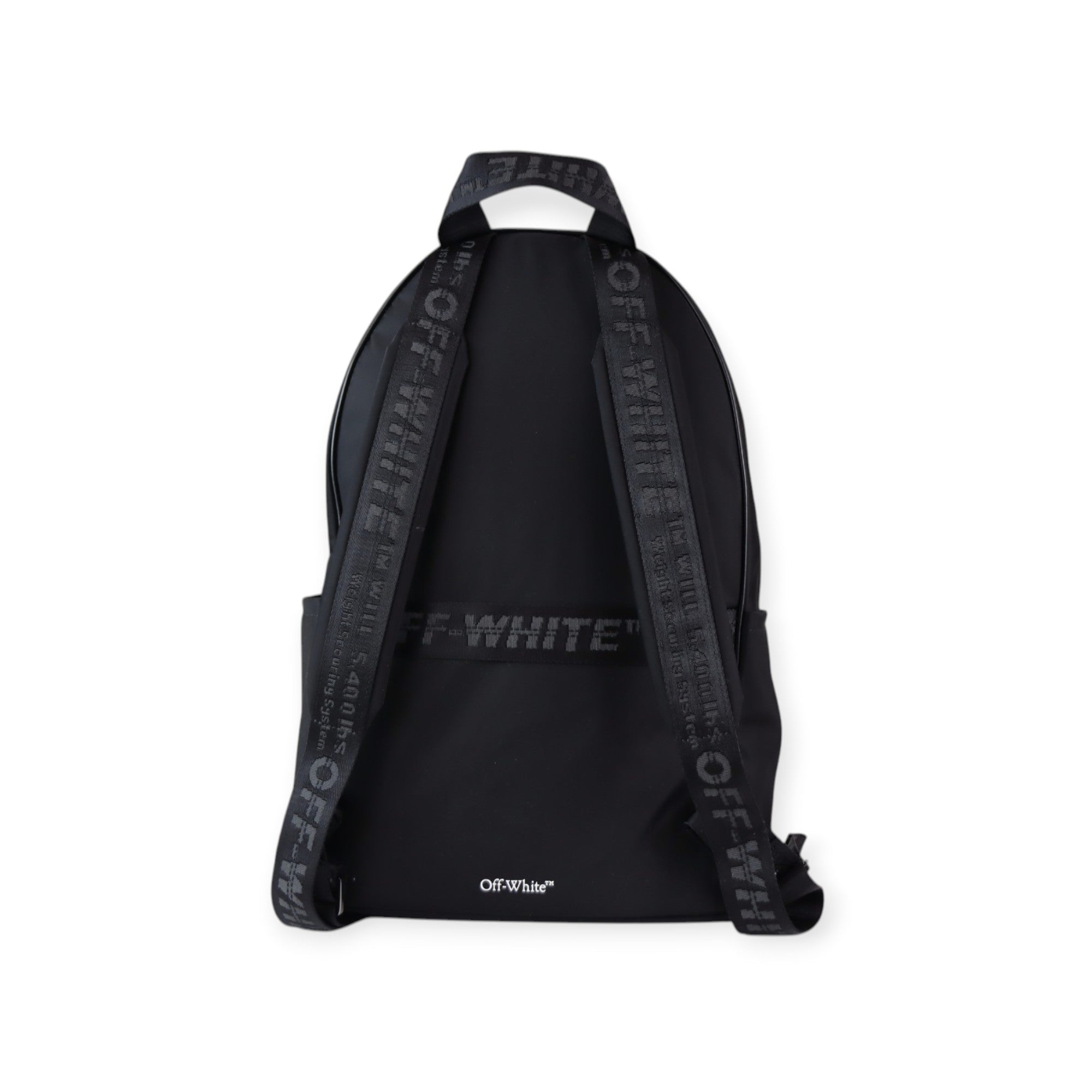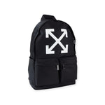 Zaino Heritage nero di OFF WHITE in nylon con stampe e logo in bianco, due tasche anteriori, chiusura con zip, spalline regolabili. Misure 29x43x15cm.